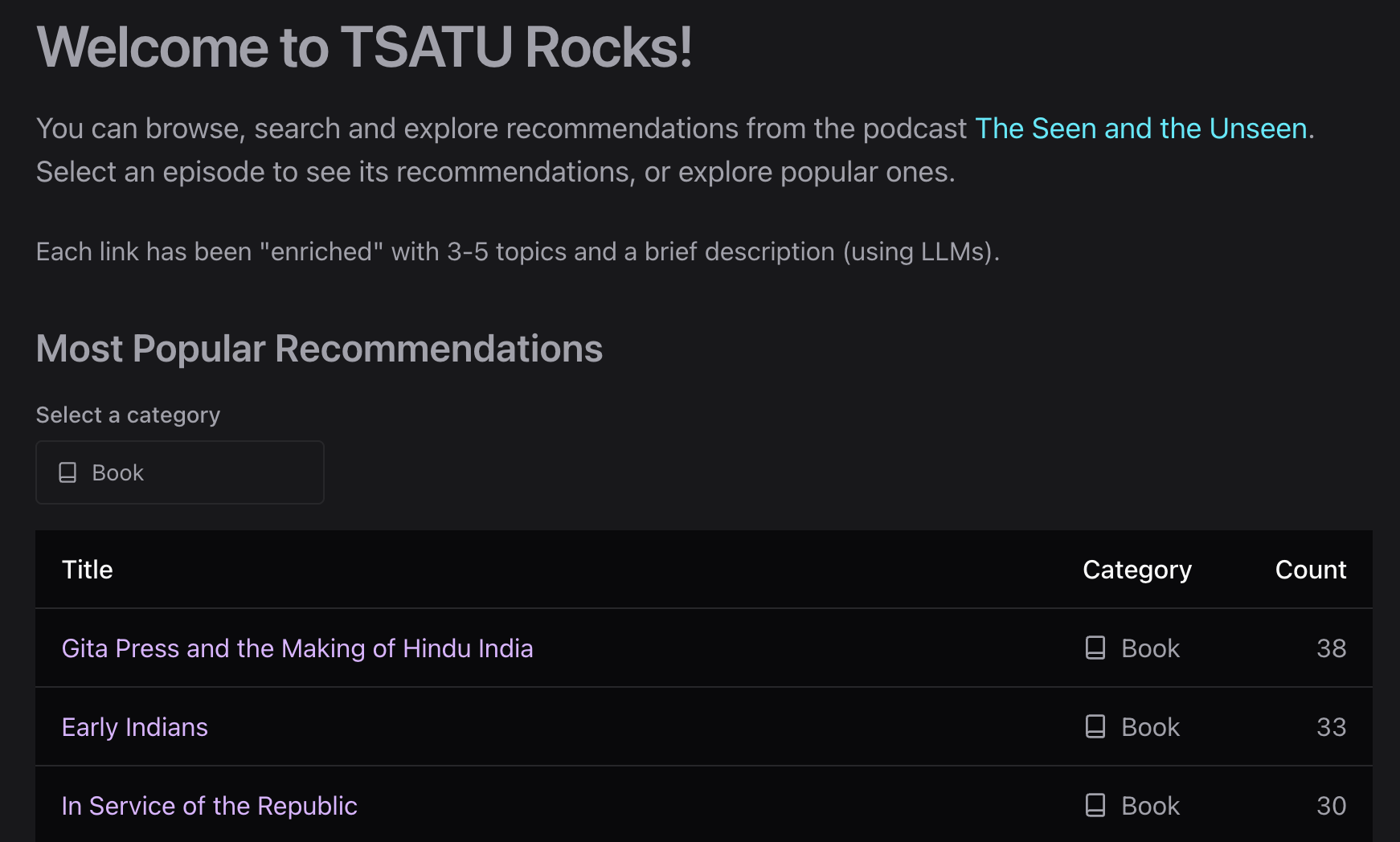 - Another challenge is deduplicating recommendations: the same book or movie or podcast might be referenced using distinct links in the show notes. For instance, a book might be linked to Amazon US in one episode, Amazon India in another episode, Kindle edition in one episode and paperback in another etc. Ditto for titles (e.g. "Rag Darbari" vs "Raag Darbari"). Right now I have a very naive dedup check: first check if the title matches, next check if the URL matches – if either is a match, it's a duplicate.