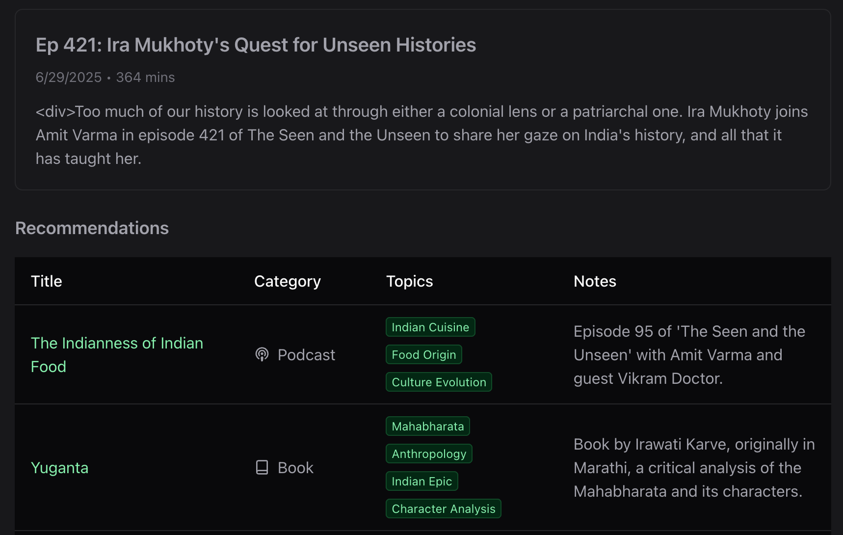 - A related challenge is getting accurate titles for things. For instance, sometimes the show notes would link the Hindi translation of a book as simply "Hindi", or link to an album would be titled "Spotify". The current implementation checks for such "generic" titles and replaces them with a placeholder title (literally