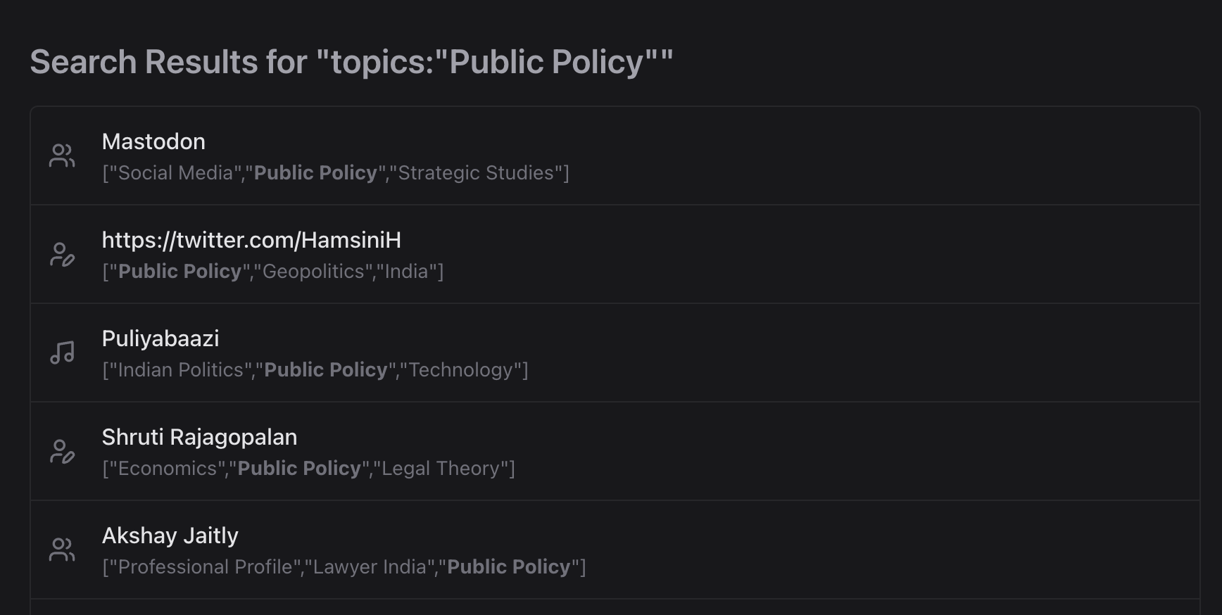 The current implementation searches over: episode titles, all recommendations, enriched topics & notes (see below). The search API endpoint currently returns 25 results, ordered by rank and also includes a snippet of the context the result was found in.